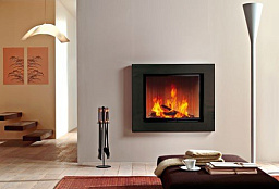 Конструкция в виде широкой рамы обрамляет вертикальную топочную камеру и придает ей дополнительную декоративность.