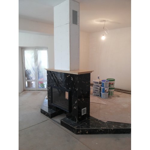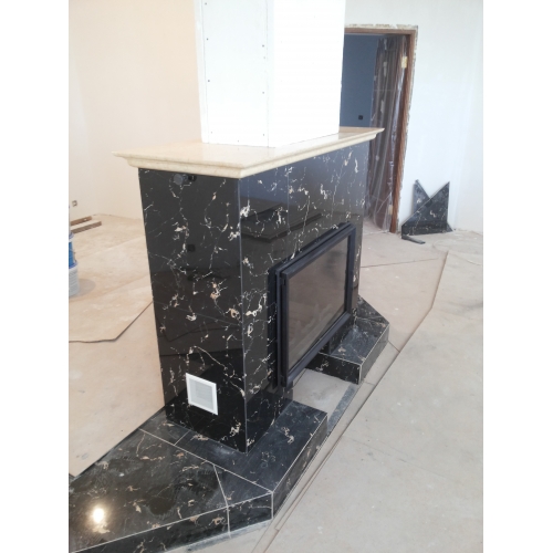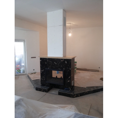 Монтаж чугунной топки Invicta 800 Double Face (2 стекла) и мраморной облицовки из мрамора.