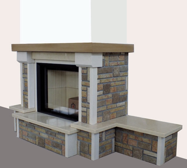 Каминная облицовка с банкетой слева 70 см. Основной материал: рваный Vicentino. Материал полки: полированный Trani.